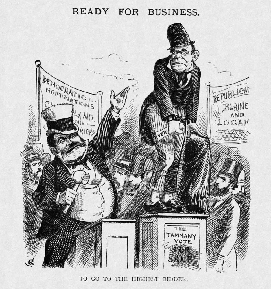 Published aprile 1, 2015 at 1125 × 1200 in I corpi degli elettori e il body politic repubblicano nell’Ottocento degli Stati Uniti (gallery) 26. Corpi corrotti: elettori in vendita, 1884. Bernhard Gillam, Ready for Business, «Puck» (July 23, l1884). «Back