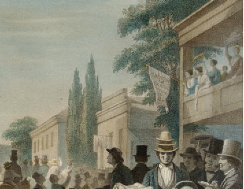 13. Corpi femminili separati: in alto a destra, le donne guardano dal balcone con uno stendardo che dice Freedom for Virtues. Remember the Ladies. Dettaglio di George Caleb Bingham, The Verdict of the People (1854-55). St. Louis Art Museum, St. Louis, Missouri.