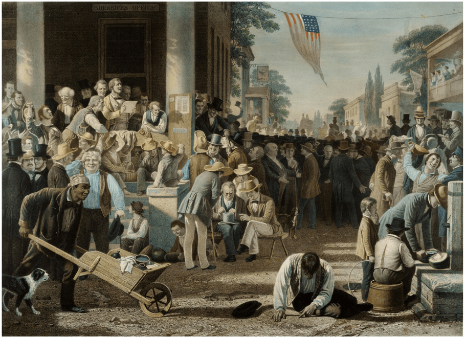 Published aprile 2, 2015 at 909 × 659 in I corpi degli elettori e il body politic repubblicano nell’Ottocento degli Stati Uniti (gallery) 12. Risultati elettorali: il verdetto del popolo, 1855. George Caleb Bingham, The Verdict of the People (1854-55). St. Louis Art Museum, St. Louis, Missouri. «Back