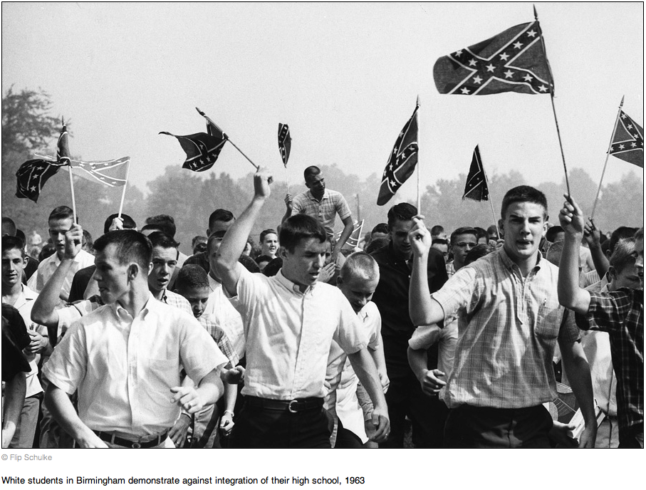 La Southern Cross è riemersa un secolo dopo ancora una volta per rappresentare gli interessi dei bianchi in opposizione, questa volta, al civil rights movement. Nel 1956 fu incorporata nella bandiera statale della Georgia in protesta contro la desegregazione scolastica (è stata eliminata solo nel 2000; quella del Mississippi ce l’ha ancora). Comparve in tutte le controdimostrazioni che accompagnarono i tentativi di integrazione, i Freedom Rides, le marce di Martin Luther King. George Wallace la usò come simbolo delle sue campagne politiche, compresa quella presidenziale del 1968. Lo sceriffo di Birmingham, Bull Connor, invitò i concittadini a “innalzare la bandiera confederata come fecero i nostri avi e a dire ai Negri, ‘Non passerete’”.
