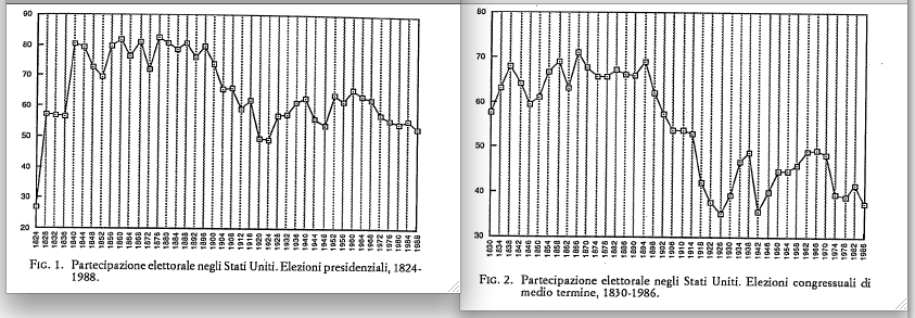 La partecipazione elettorale si va lentamente erodendo anche nel nostro paese, che pure era solito produrre (e continua a farlo) tassi di affluenza fra i più alti d’Europa. Nel travagli del nostro sistema politico, che sembra preludere a un vero e proprio cambiamento di regime, il significato di questo crescente «partito del non voto» non è chiaro. E’ il segno dell’allontanamento dei cittadini dal presente sistema in crisi, oppure è una caratteristica anticipata del sistema prossimo venturo? Riuscirà la diffusa partecipazione politica popolare a sopravvivere al decadimento dei partiti organizzati di massa? La «seconda repubblica» evocata e invocata da più parti sarà basata su un elettorato ridotto e socialmente stratificato, con settori della popolazione virtualmente espulsi dal mercato elettorale e dalla rappresentanza politica? E’ anche con queste domande «italiane» in mente che è stato iniziato (ormai parecchi anni fa) e condotto questo studio sulle origini della crisi di partecipazione negli Stati Uniti. Ed è forse inevitabile che le risposte del cittadino a queste domande (che sono diventate, in verità, sempre più pessimistiche e preoccupate) possano aver influenzato le strategie di ricerca adottate dallo storico. Non si tratta, fra l’altro, di un problema esclusivamente italiano. La mobilitazione elettorale è in declino in altri paesi del nostro continente, e si cominciano a formulare domande dal chiaro sapore americano su «la scomparsa degli elettori» in Europa occidentale. E’ possibile, insomma, che in questa fine di secolo si verifichi una ulteriore inversione di tendenza nel paradigma transatlantico, in questo caso nella direzione di una omologazione dei comportamenti, e quindi dei problemi che i sistemi democratici in Europa e negli Stati Uniti devono affrontare.