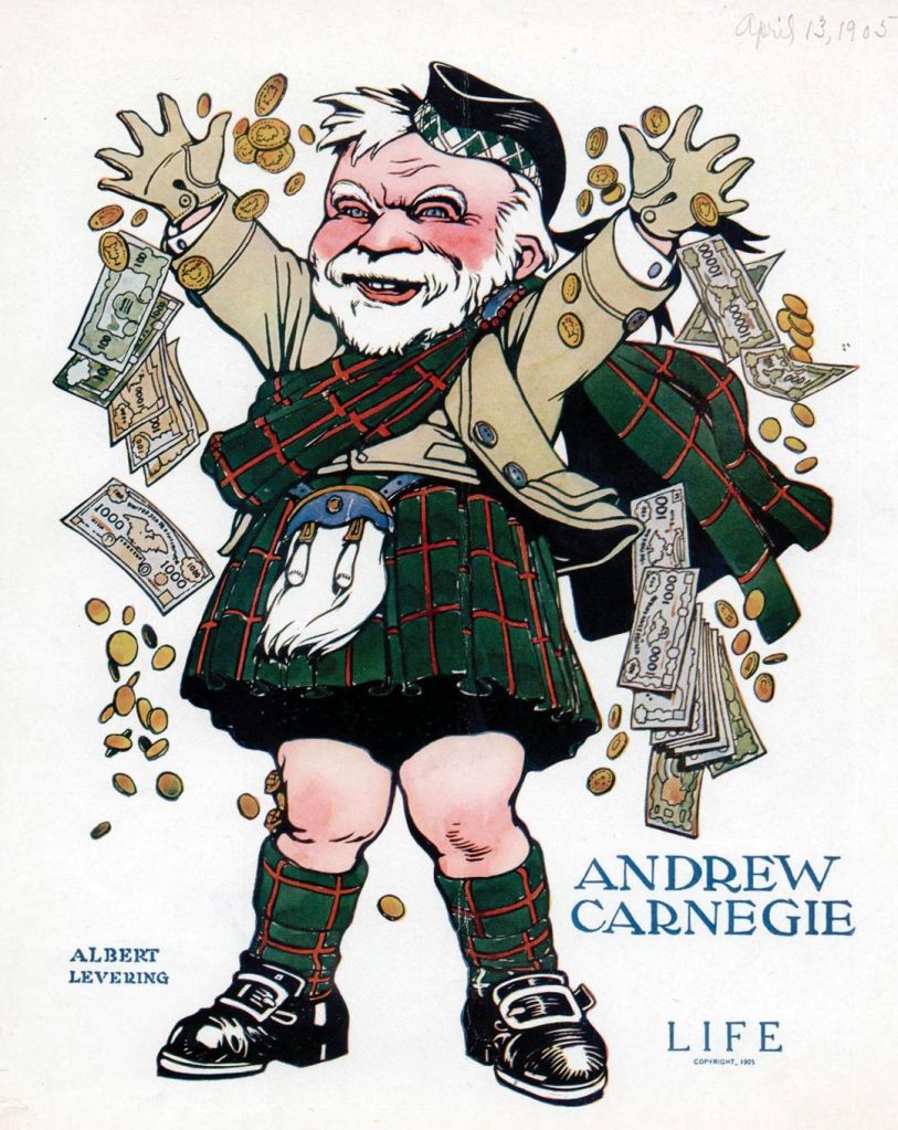 Andrew Carnegie fa parte di una schiera di nuovi industriali, banchieri, finanzieri, che stanno cambiando il panorama economico, sociale, politico, del paese nei decenni dopo la Guerra civile e ben dentro il Novecento. Sono i protagonisti della Seconda rivoluzione industriale. Sono imprenditori capitalisti che usano le regole del libero mercato e della concorrenza per uccidere il libero mercato e la concorrenza, perché diventano (quasi) monopolisti. Qualche altro nome notissimo, quasi leggendario, oltre a Carnegie? Il petroliere (e molto altro) John D. Rockefeller. Il mega-finanziere e banchiere J.P. Morgan. I padroni delle ferrovie, Cornelius Vanderbilt nella East Coast e Leland Stanford in California. Il padrone delle miniere Solomon R. Guggenheim. Il padrone delle ferriere Henry Clay Frick, sodale di Carnegie nel business dell’acciaio.