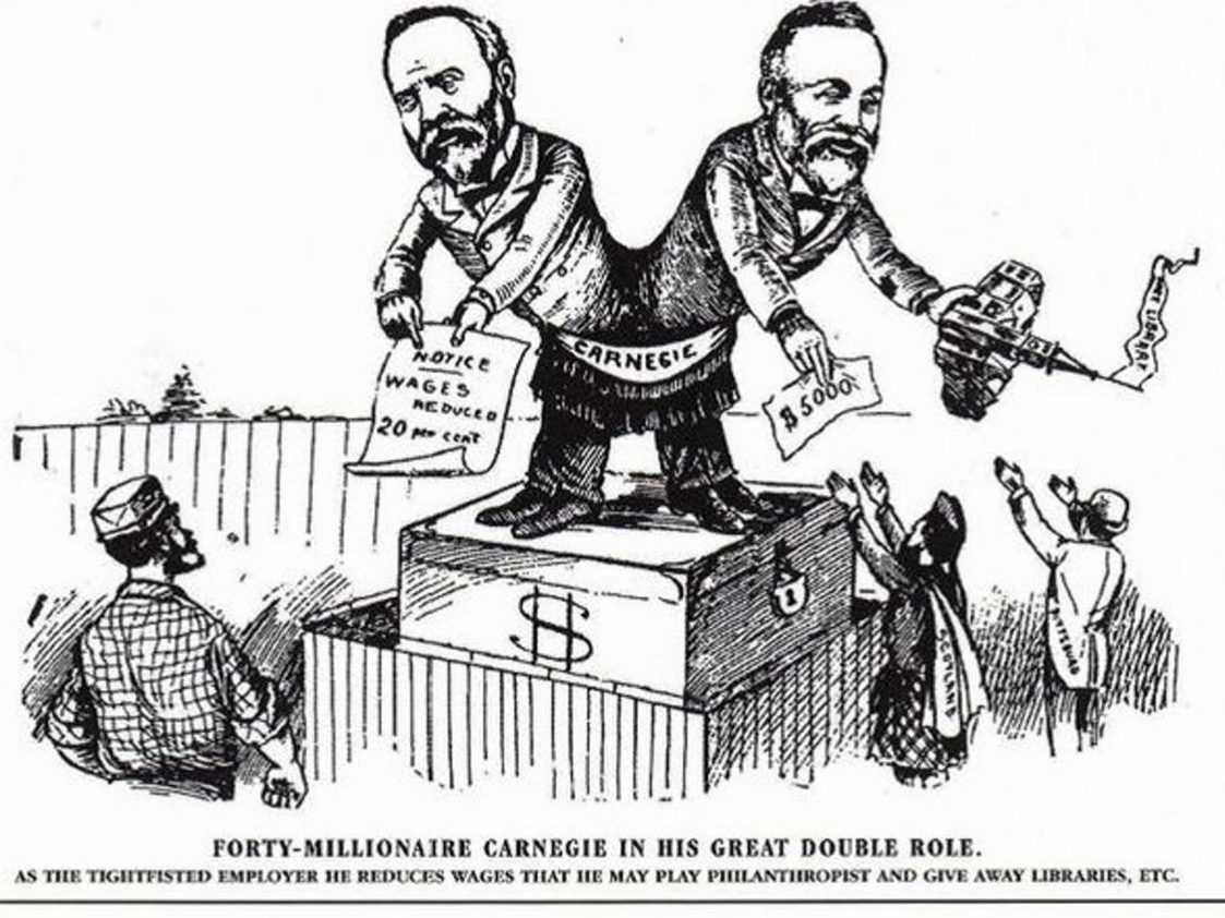 Andrew Carnegie è uno dei padroni dell’acciaio negli Stati Uniti. Nel 1901 è al centro della creazione della U.S. Steel Corporation, l’enorme società per azioni che ha il monopolio del settore. Il luogo in cui agisce, Pittsburgh, è la capitale dell’industria siderurgica e carbonifera del paese. Egli stesso è l’incarnazione del New Money, del self-made man, un immigrato scozzese diventato ricchissimo che decide di spendere tutti i suoi soldi in opere “per il bene pubblico”. Dice: “Il ricco che muore ricco muore in disgrazia”. Si calcola che abbia investito il 90% dei suoi beni, centinaia di milioni di dollari (milioni di allora), in imprese filantropiche, in musei e università, in fondazioni per la promozione della pace (ahimé, alla vigilia della Grande guerra), in sale per concerti e spettacoli come Carnegie Hall a New York, in migliaia di public libraries di cui la New York Public Library nel cuore di Manhattan è il fiore all’occhiello: biblioteche aperte a tutti, per l’istruzione di tutti e, per statuto, gratuite.