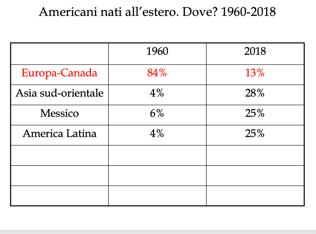 La migrazione è stata enorme, ha coinvolto fino a oggi probabilmente 60 milioni di individui. Ed è stata, per provenienza geografica e composizione etnica, di tipo diverso rispetto al passato, una novità per i vecchi americani, cioè per i figli dei vecchi immigrati, che erano quasi tutti di origine europea. Ora è vero il contrario. Ora i migranti europei sono praticamente scomparsi. I nuovi immigrati arrivano per metà dalle Americhe a sud del Rio Grande, sono quindi di origine ispanica, equamente divisi fra Messico e resto del continente. Per più di un quarto arrivano dall’estremo occidente che diventa oriente, dalle isole del Pacifico e dall’Asia, da Filippine, Corea, Vietnam, Cina, India. Infine ci sono quote più piccole ma crescenti di origine nordafricana e medio-orientale (araba, musulmana) e di origine africana subsahariana.