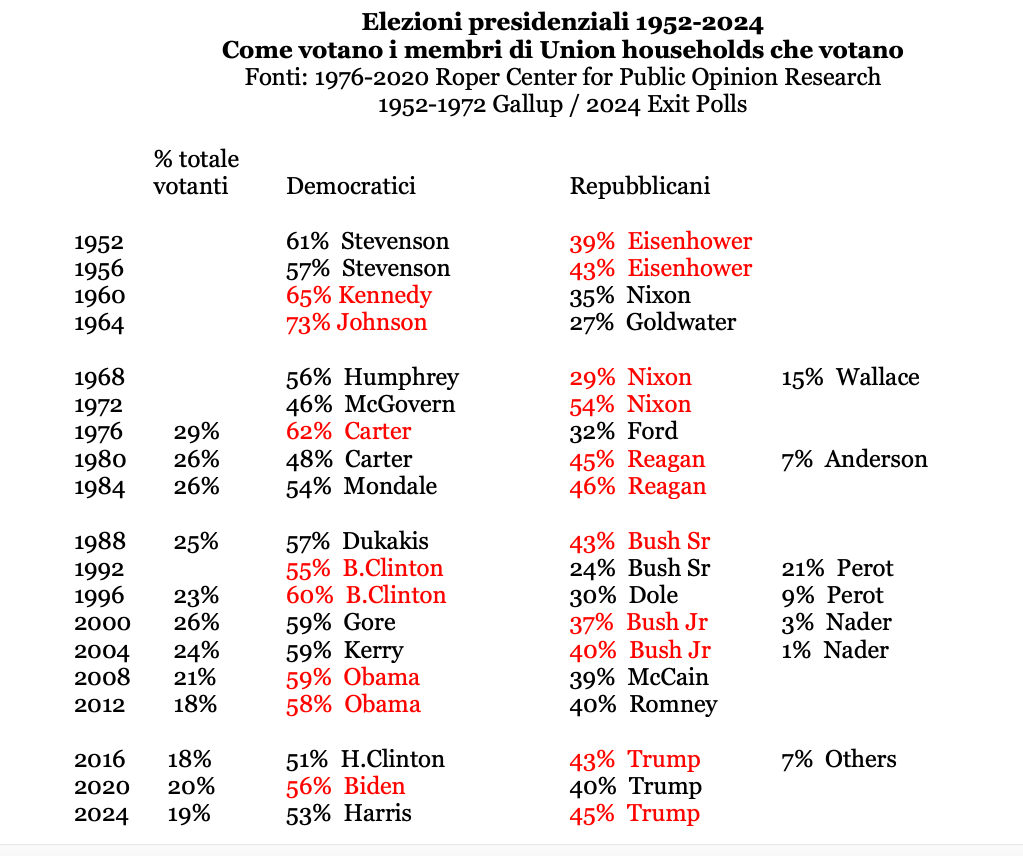 Il consenso elettorale degli iscritti ai sindacati è storicamente considerato uno dei pilastri del partito democratico, in particolare di quello newdealista prima della crisi politica del 1968-1972 e della crisi economico-sociale degli anni settanta. La tabella qui sotto, che mette in fila il voto dei membri delle union household dalle elezioni presidenziali del 1952 a oggi, conferma e insieme qualifica al ribasso questa convinzione. (Le union household sono le unità famigliari in cui ci sia almeno un tesserato sindacale. Si da per scontato che tutti i membri votino come un blocco, magari sotto l’influenza di… un patriarca? Chissà se questa aggregazione statistica è ancora valida.)