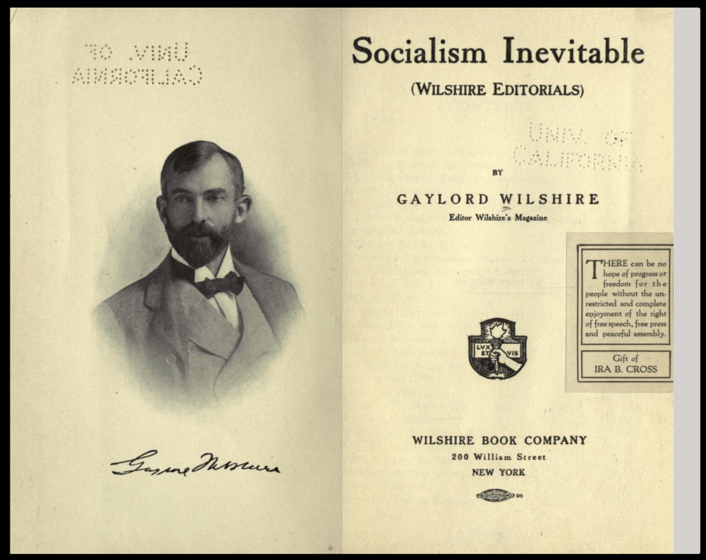 Gaylord Wilshire era un “milionario socialista” arrivato dall’Ohio a fine Ottocento, speculatore edilizio con il ritratto di Marx in ufficio, editore di un mensile socialista da mezzo milione di copie (Wilshire’s Magazine, pubblica a puntate Il popolo dell’abisso di Jack London), candidato seriale a mille cariche pubbliche prima di abbandonare la politica elettorale e di abbracciare l’anarco-sindacalismo e lo sciopero rivoluzionario, sodale di Emma Goldman. In tarda età, dopo la Grande guerra, fu promotore di una cintura elettrica salutista dagli effetti miracolosi (un quack doctor alla Dulcamara, insomma). Morì in povertà a New York.