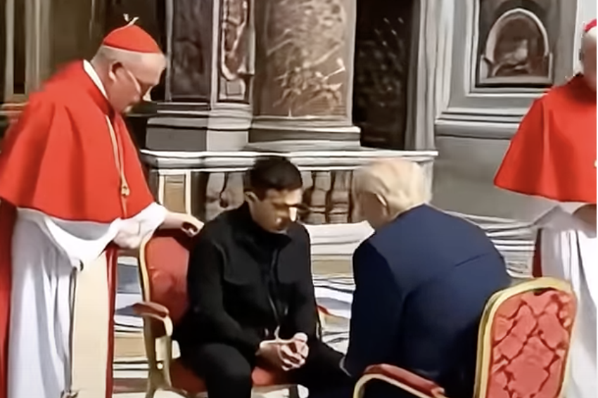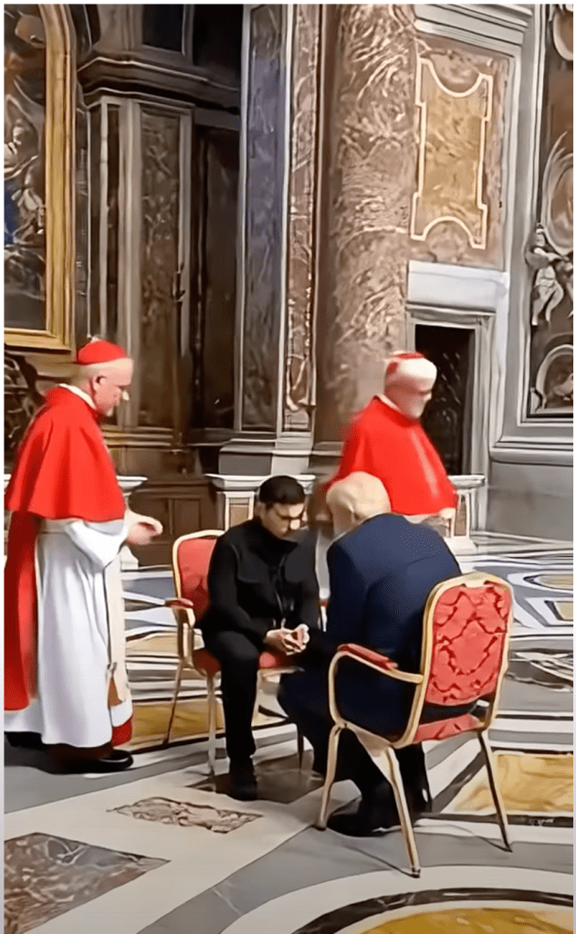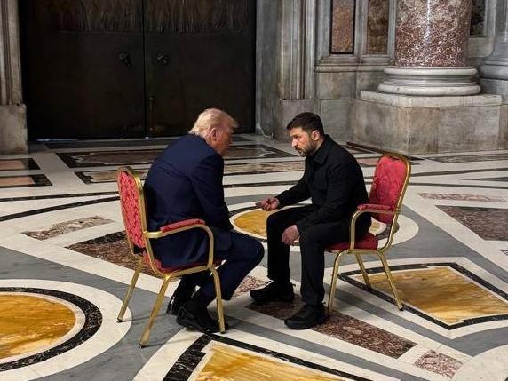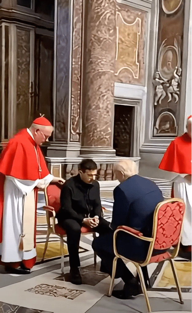 La prima fotografia che ho incontrato e usato è questa qui sotto, è ovunque, è ormai storica, sembrava a me come a tanti la più adatta, drammatica, potente. Descrive un incontro raccolto e intenso, quasi religioso, in un ambiente solenne, silenzioso e vuoto. Un po’ l’esatto opposto dell’incontro pubblico di qualche settimana prima, quello finito in rissa in un Oval Office claustrofobico e kitch, affollato e sguaiato. È questo il messaggio, no?