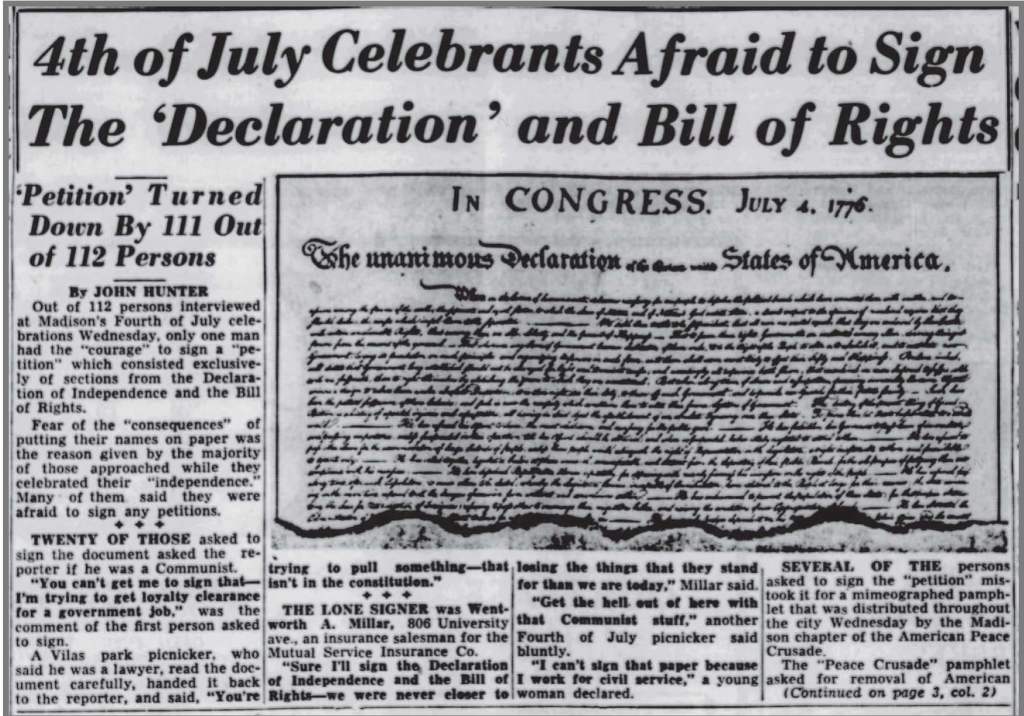C’era una volta a Madison, Wisconsin, la celebrazione del Quattro luglio dell’anno di grazia 1951. Al più giovane reporter appena assunto del quotidiano cittadino, The Capital Times, toccò la corvée di fare il solito pezzo sul picnic du jour nel parco cittadino. Giusto per non annoiarsi a morte, gli venne un’idea. John Patrick Hunter, questo il suo nome, preparò al ciclostile un volantino con il preambolo della Dichiarazione di indipendenza, quello tutto eguaglianza, felicità, rivoluzione ricordato qui sopra. Aggiunse i primi emendamenti del Bill of Rights della Costituzione, quelli sulle garanzie dei diritti di libertà. E fece finta che si trattasse di una petizione popolare nuova di zecca da inviare al governo.