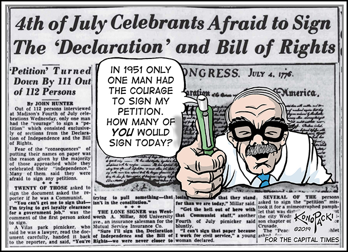 Naturalmente quelli del 1951 erano tempi di maccartismo. Tempi di caccia alle streghe politiche e intellettuali, di campagne di menzogne, di degenerazione del discorso pubblico diventato uno scontro violento fra «noi» e «loro» dove i «loro» perdono legittimità, diventano un-American. Tempi di sospetti e paure fra i cittadini, anche nelle relazioni fra loro. Rievocando quei tempi di recente, l’attuale editor emeritusdel Capital Times, David Zweifel, ha scritto: «Ora, 74 anni dopo, è impossibile prendere un giornale o accendere la TV e non vedere le somiglianze tra allora e oggi».