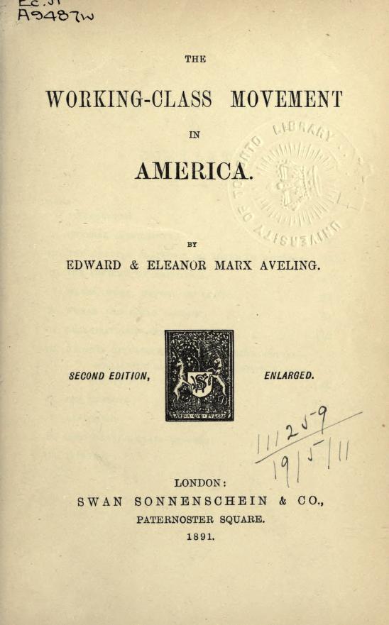 Nel 1886 e poi di nuovo nel 1888 la figlia di Karl Marx, Eleanor Marx Aveling e il di lei marito Edward Aveling, vanno negli Stati Uniti in due tour di agitazione politica. Nel 1886 sono accompagnati anche da Wilhelm Liebknecht e fanno fundraising per il partito socialdemocratico tedesco. Parlano del movimento sindacale, della lotta per la giornata di otto ore, dei riots di Haymarket a Chicago, dei diritti delle donne, delle prospettive del movimento socialista in Nord America. Una delle cose su cui insistono è questa: sarà bene che i socialisti americani la smettano di usare il tedesco nelle loro attività di propaganda, adottino l’inglese, se vogliono allargare il loro campo d’azione fuori dalle comunità immigrate. Ne scrivono in un libro, Eleanor Marx Aveling e Edward Aveling, The Working-Class Movement in America, London, Swan Sonnenscheib & Co, 1888.