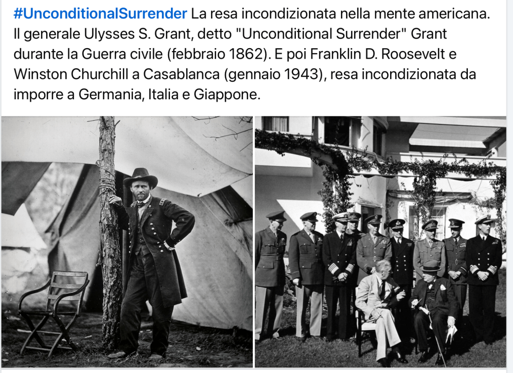 La frase coniata dal generale unionista Ulysses S. Grant durante la Guerra civile americana (febbraio 1862), “Nessuna condizione può essere accettata se non una resa incondizionata e immediata”, era un po’ buttata lì, aveva un valore episodico e militare. Si riferiva alle truppe confederate che si erano arrese in quella specifica battaglia, a Fort Donelson, in Tennessee. Non implicava una politica generale nei confronti del governo confederato, che in questi termini non ci fu. Anche ad Appomattox (aprile 1865) la resa finale del generale Robert E. Lee a Grant riguardò l’esercito da lui comandato, la Army of Northern Virginia, non la Confederazione. E ci furono condizioni: i soldati del Sud tornarono a casa, liberi, con le armi personali.